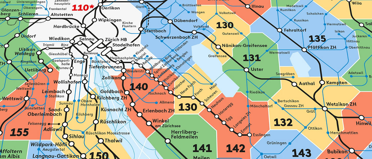 Bitte beachten Sie: Die Tarifzonen 110 (Stadt Zürich) und 120 (Stadt Winterthur) zählen je als zwei Zonen, da das Verkehrsnetz in diesen Bereichen besonders dicht ist.
